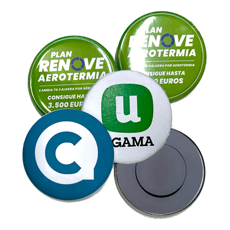 Chapa personalizada redonda de 50mm de diámetro con imán trasero, agarre medio. Ideales como imán de nevera o para pizarras magnéticas de tipo «Veleda». Personalizadas y muy divertidas para todo tipo de recuerdos y eventos. Cuerpo metálico y acabado laminado brillo. Impresión de alta calidad.